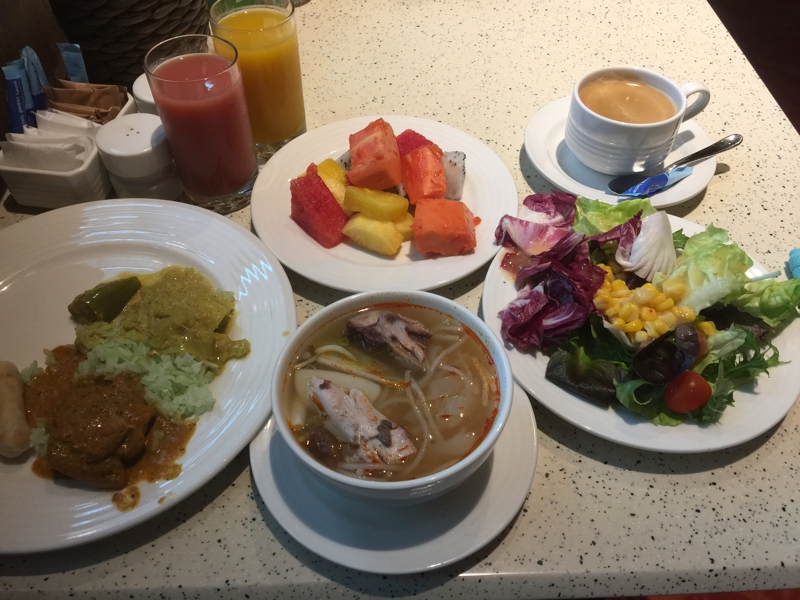 9時過ぎに朝食ビュッフェに来ました。やはり少し待たされました。席はあるのだけれど、案内するスタッフが少なそう。先進国シンガポールでは人件費もフィリピンやインドネシアのようには行かないのでしょう。また節約する為に朝食は目一杯食べてしまいます。今日もまたスープのフォー、翡翠炒飯にカレーをかけました。そしてサラダ、フルーツともにたっぷり、苦しくなるくらい食べました。