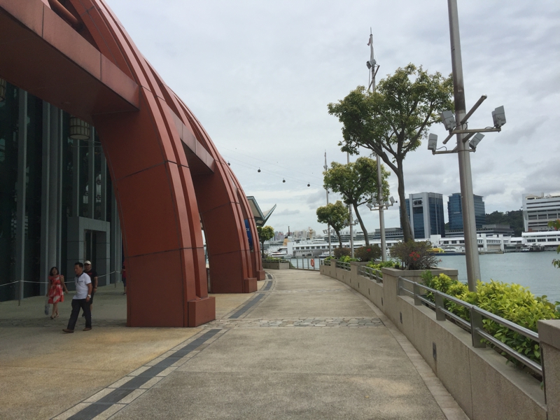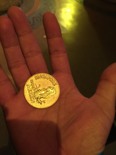 エレベーターを降りました。本当に動いているの? と思うくらいゆっくりのエレベーター、時間が掛かりました。ここはマーライオンの口、まぁそこそこの高さ、ビルで言えば10階くらい? ウニバーサル・スタジオに繋がるアーケードが延びています。はるか遠方にシンガポールの中心部、ベイエリア? 明日出向きますが、決して遠くはなさそう。あいにく空はどんよりしています。
