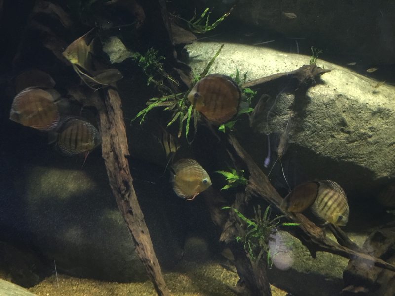 ディスカスの水槽、水草水槽にこのディスカスを泳がせるのが夢でした。しかしデョスカスが好む水温は30度、水草が好む水温は24度、お互いを妥協させながら調整し、共存させるのが難しいのです。しかもクリニックの待合室にそんな水槽を置いて、子供がふざけて水槽を叩いたりしてディスカスを脅かすと餌を食べなくなり死んでしまうようなデリケートな魚なのです。やはりうちでは無理!