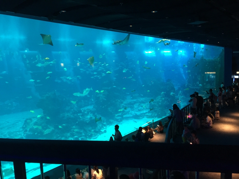 暫し廻りの客と同様、床上に座ってこの水槽を眺めていました、なかなかの迫力、海の中にいるような感覚に陥ります。長さ30m以上に渡って広がる大水槽、その手前は雛壇になっていて、みんあ堂々と座り込んでみています。それに紛れ込んで床に座っていても大丈夫そう、中にはサメ、マンタ、でかいハタなどがいて、更に小魚もたくさん泳いでいます。食べられちゃったりしないのだろうか?