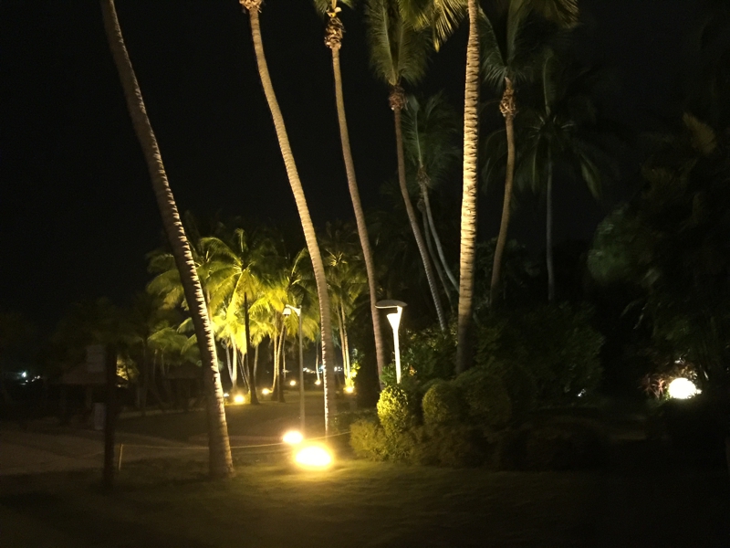 ホテルの部屋でノンビリ2時間ほど、やはり自由に行動を決められるのは気が楽です。暑かった外から冷房の利いた部屋へ、ホッとする瞬間でもあります。少し昼寝もしました。自室のベランダから見下ろすこのホテルの庭、大きなプールがあります。如何にもリゾートホテルと言った佇まい、午前中はそこそこ歩きましたから少し休養を取って暗くなり始めた頃に出掛ける事にしました。