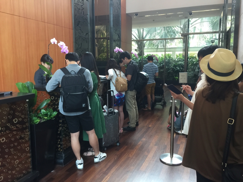 ホテルに着きました。どっひゃ〜! 案の定……、チェックインに中国人の長蛇の列、覚悟していたとは言え、予想以上の混雑、これだと部屋に落ち着くまで2時間くらい掛りそうだな? チェックアウトもこんなだったら飛行機に乗り遅れちゃう。前もって聞いてはあったのですが、11時くらいにチェックアウトすれば2時の飛行機には間に合う? いやぁ、これじゃ危ないかもよ……?