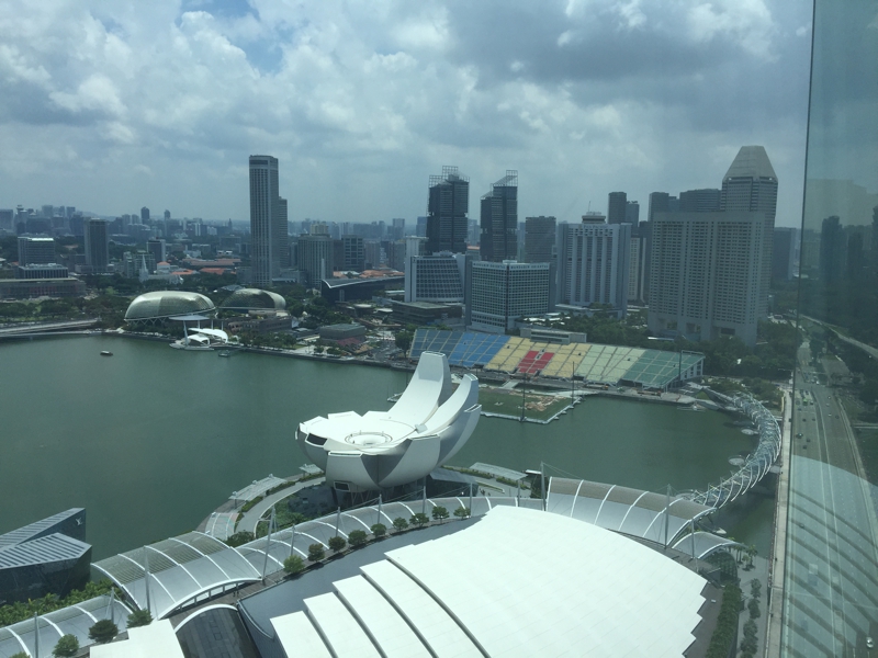 シンガポールの街の中心部が見えます。夜景も綺麗そう、部屋の窓側ガラス面は足下から天井まで全面です。夜は酒を飲みながらこの景色を眺めているだけでおつまみは要らなそう。ここは湾になっていて、二本の川が出入りし、海へと繋がるようです。正にシンガポールのど真ん中? いわゆるベイサイドエリアです。日本で言えばお台場のような処? エアコンもバッチリ効いていました。