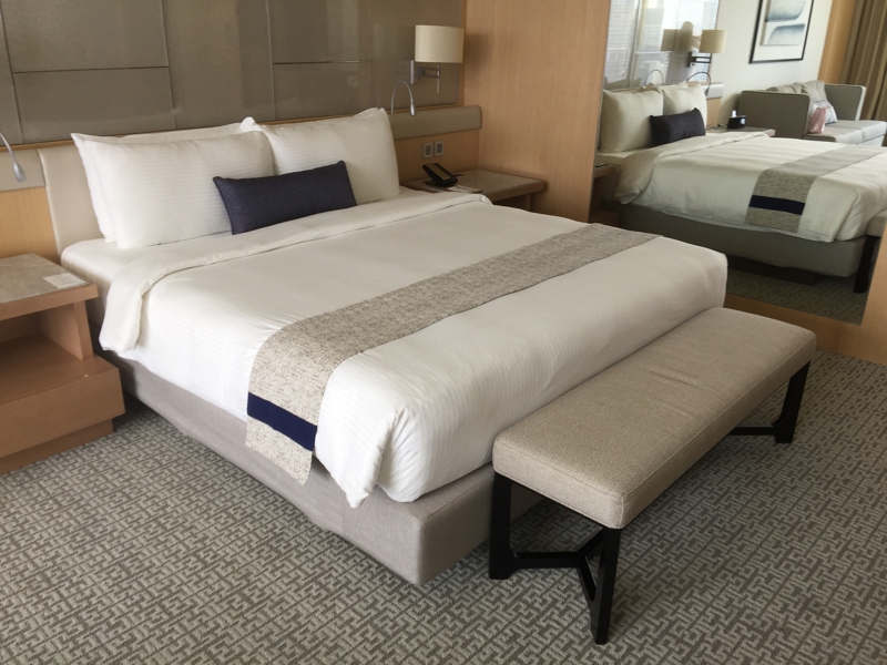 ベッドはキングサイズのなかなか寝心地の良さそうなもの、ゆったり出来そうです。いっそのことカーテンを閉めないで寝れば、明け方に自然に明るくなって来て良い雰囲気になりそう、部屋全体はそれほど明るくならないながらも、むしろ夜景を楽しめるような構造になっていそうです。まぁ、この部屋に戻って来るのは夜だけなのだろうから、それほどの贅沢を言うつもりはありません。