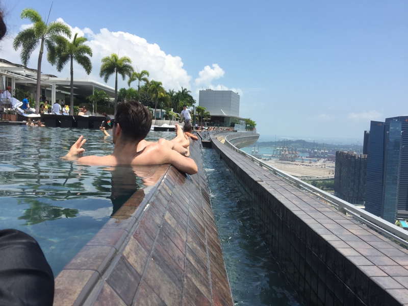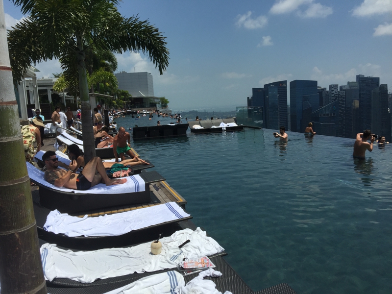 人ごとながら心配になります。シンガポール、国民全体が富裕層で固まり、近代的な街もすごく光って見えます。そして正にその近代都市のど真ん中にこのランドマークがある、プールのヘリから見下ろす景色も近代化されて古い建物は殆どない? 恐らくはバブル絶世? バブルはいつかははじけることを考え、早い今の時期にここを訪れたのは正解だと思っています。幸いにお天気にも恵まれました。