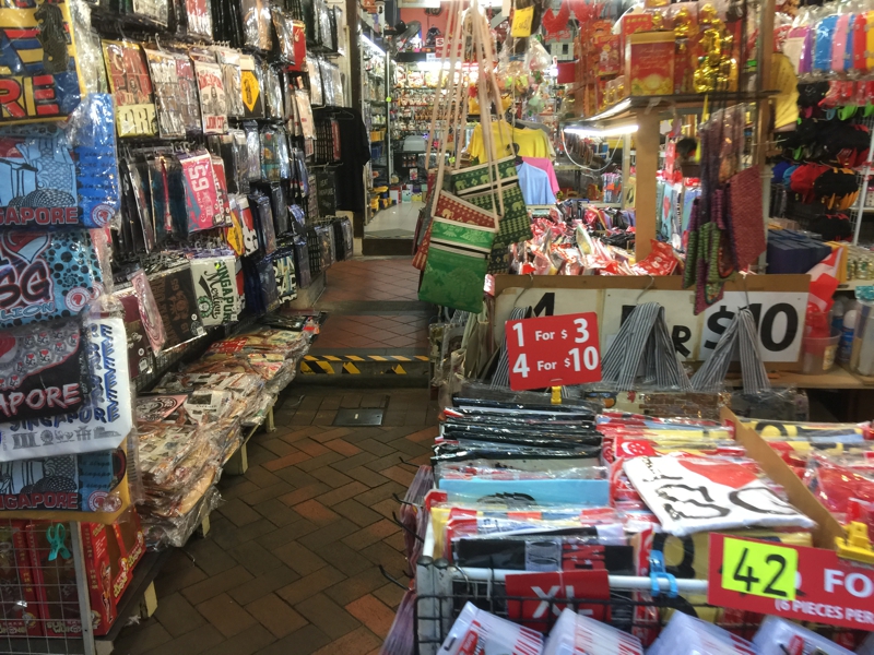 こんな店で少しお土産も買いました。実はマリーナベイ・サンズのホテル内ショップでオリジナルのTシャツを売っているのを見つけました。家族やクリニックのスタッフ、友人達にごっそり買って行く事になります。ここでは小物を、例えばマーライオンのガラス玉入りの置物とか。リゾート地のセントーサ島に比べ、さすがに中華街に来ると物価は日本並みになるようです。でも安くはない?