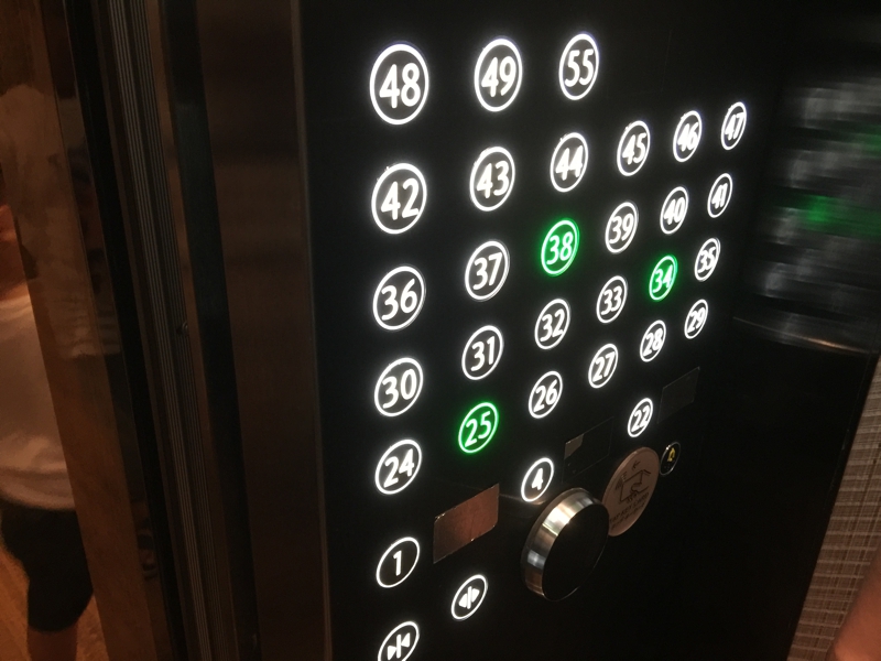 エレベーターはこんな感じ、あまり待たされる事なく、24階から55階までで6台のエレベーターがあります。但し、結構各駅停車で移動する時に時間が掛かる事があります。僕は38階、こんなビルが3つもあるのですから、数千人のゲストがたむろしていることになります。一晩○万円で収入は? なんて計算をしてみました。何年くらいでこの建物はpay出来るのでしょうか? ここの人件費は?