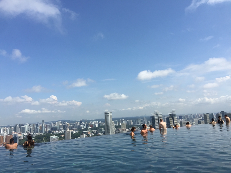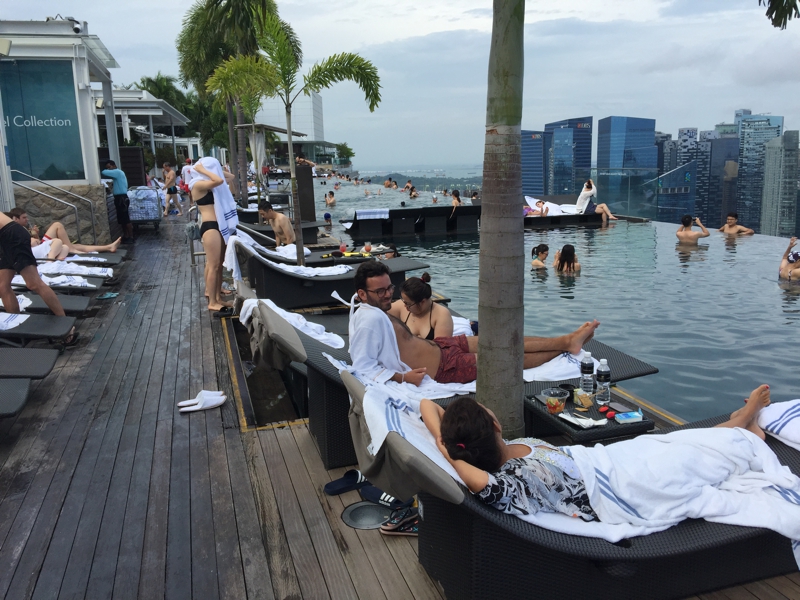 さて! プールに出掛けます。そこそこ混んでいるものの、デッキチェアは空いているところもありました。お天気はまずまず、北の方には若干雲があるものの、真上には青空が。日光も燦々と降り注ぎます。そう、このプールに来る為に今回のシンガポール行きを計画したようなもの、もし土砂降り続きでプールに出られなかったらどうしようか? などと考えましたが、どうやら杞憂だったようです。