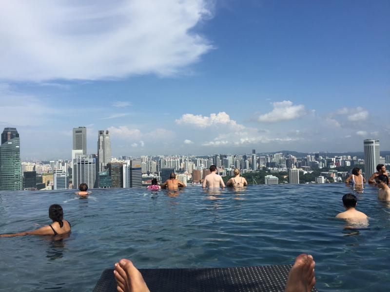 この太陽です! しかしマニラのような肌に刺す、チリチリ来るような陽の光ではなく、何となくやんわりと肌に届くような優しい陽射し、でも例年になくここシンガポールで良く焼けました。せっかくここまで来たのだから、充分に焼いて帰らなきゃ損をするよう、これなら骨粗鬆症になることもないでしょう。朝の10時前くらいから午後の2時頃までこの天国にいました。天空のプール、来て良かった!