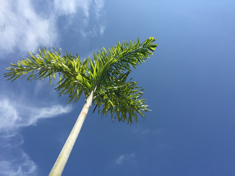 頭の上はこんな状態です。抜けるような青空、57階の屋上でも椰子の木が立っていますが。熱帯、ほぼ赤道直下のこの地に良く似合う構図です。もう旅行の後半ではありますが、今回の旅行はお天気には恵まれました。感謝! しばしここに転がり、iPodで好きな音楽を聴いていました。あいにく人が多いので雑踏ではありますが、イヤホンをしてしまえば、例のうるさい中国語も気になりません。