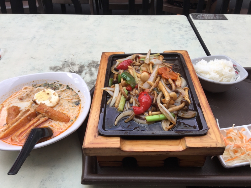 午後3時過ぎ、いくら朝食ビュッフェで目一杯詰め込んで来たとは言え、さすがにお腹が空いて来ました。中華街の屋台料理の店が並ぶエリア、道路の真ん中にテーブルと椅子が置かれているところで食べる事にしました。シンガポールに来る前から研究して狙っていたラクサと言うスープ、ココナッツミルクのベースに海老の香りがたっぷりする美味しいスープ、それにキノコのソテーを頼みました。