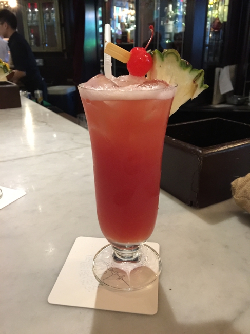 シンガポールスリングを頼もうと考えていた矢先、ウェイター自ら’Singaporesling?’と尋ねて来ました。言葉に詰まりつつ、首を立てに振ると間もなく、こんな赤いカクテルが運ばれて来ました。もう100年以上の歴史のある伝統のカクテル、シンガポールスリングです。一口飲むと……、美味い! 何とも言えない酸味、決してしつこくない甘み、後から追いかけて来るアルコール、不思議……。