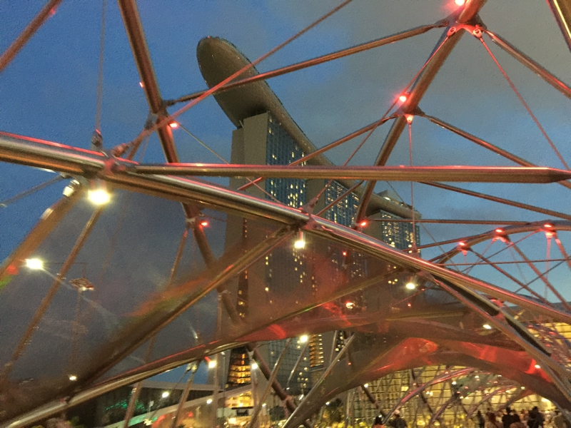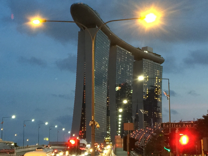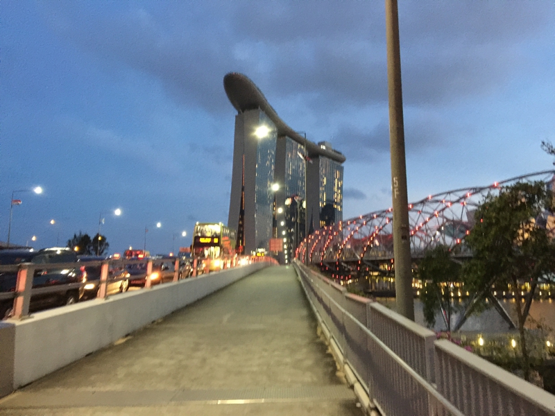 遊歩道はライトアップされ、ちょっと良い雰囲気、見上げると巨大な建物が3つ並んで見えます。ラッフルズホテルを出てから小一時間、途中マンダリンホテル等で寄り道はしましたが、シンガポールスリングを2杯飲んでちょっと良い気分で素晴らしい景色を眺めながらのんびり歩いて来ました。その間、マリーナベイ・サンズは何処からでも見えるので、大体の距離感は掴めました。