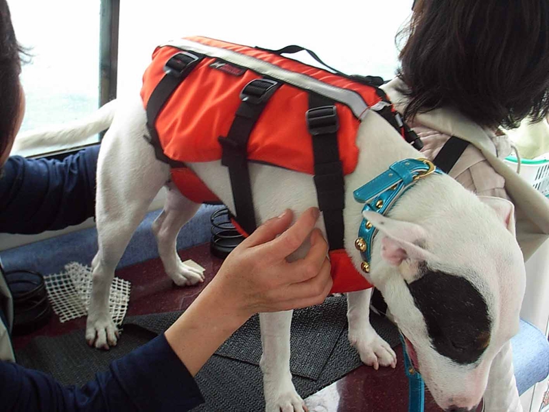 これが今日のために愛犬に通販で購入したライフ・ジャケット。本当に浮くんだそうです。いっちょ、海の中に突き落としてみるか? お前、泳いだことないもんなぁ。