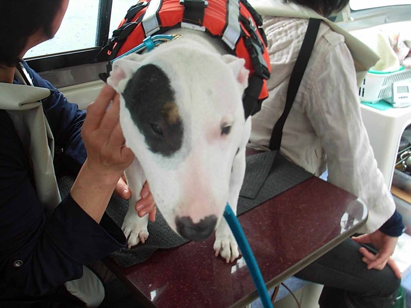 こいつは恐怖感に曝されるとこのように尻尾が丸くお腹側に廻り込みます。もうガチガチ。エンジンの音、波を切る船体の音、水の跳ねる音、聞き慣れない音ばかり。