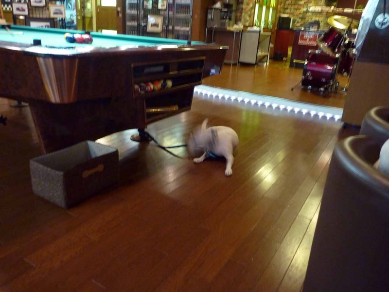 帰りに家の近くのドッグカフェに寄る事にしました。この店には半年ぶりぐらい。おつきあいご苦労様、疲れたろう? 帰りはずっと眠っていたようです。あいにくの天気だったし、今日は室内が多かったからちょっと辛かった?