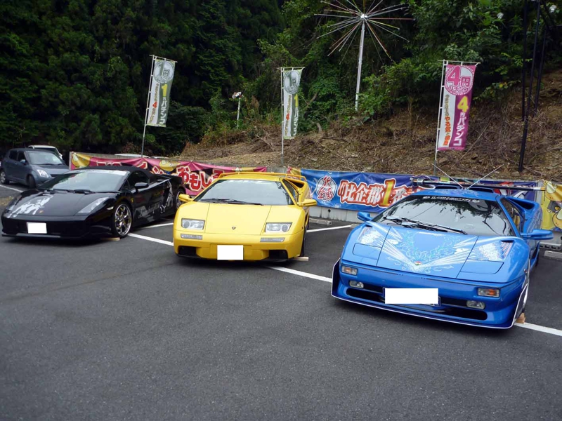 集合場所までたどり着くまでかなり手間取り、時間ギリギリ、僕が到着するとすぐに出発となりました。食事も出来ないままスタート、30分ほど走って今日の会場へ到着、今日はランボばっか、フェラーリはいません。